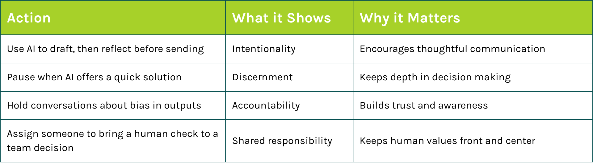 It can suggest what to say, but it doesn’t know what it means to say the right thing at the right moment. The leadership work still lives in the pause before speaking. In sensing what’s needed, not just what’s next. That’s a human skill, and it grows with practice.